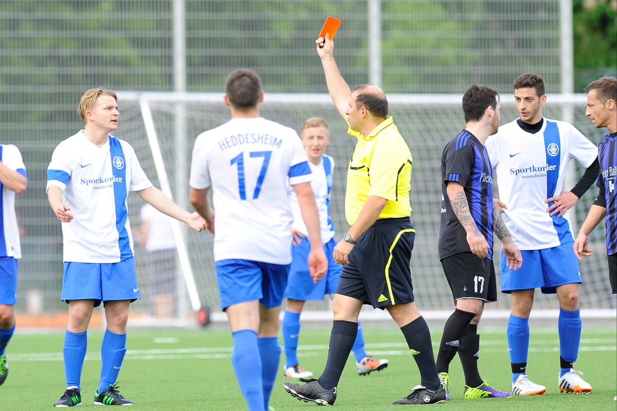 Foto: Krasse Fehlentscheidung von Schiedsrichter Bernhard GRünewald, der nach einem „Allerwelts-Zweikampf“ vollkommen überzogen gegen Heddesheims Sebastian Pah die Rote Karte zieht.