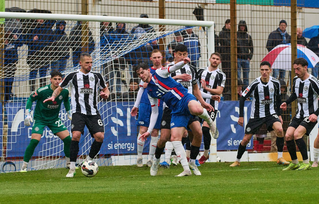 Sein Team hatte sich jedoch einen klaren Matchplan zurechtgelegt, um diesen anspruchsvollen Gegner zu knacken. Die ebenfalls stark agierenden Quadratestädter ließen Aalen im Spielaufbau zunächst gewähren und fokussierten sich auf Umschaltmomente. „Wir haben schon einige von diesen gehabt“, merkte Abele an. „Leider kam der letzte Pass nicht immer an.“ Mit fortschreitender Zeit stieg das Selbstvertrauen bei seiner Mannschaft. Nach einer guten halben Stunde hätten die Blau-Weiß-Roten in Führung gehen können: Der im Rückraum positionierte Teamkapitän Alexander Esswein bekam von Alexandru Paraschiv den Ball serviert. Esswein ging volles Risiko und zog volley auf das Tor ab. Da ihm der Abschluss auf dem glitschigen Untergrund jedoch über den Spann rutschte, landete der Ball neben dem Gehäuse der Gäste (35.). Wenige Minuten später scheiterte Pasqual Pander aus Nahdistanz an der kompakt stehenden Aalener Defensive (40.).