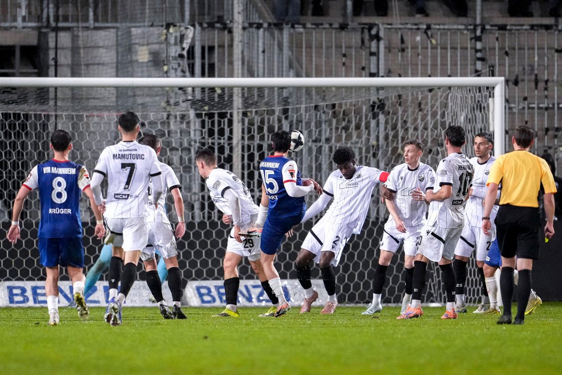 Mitte der ersten Hälfte folgte eine Dreifachchance für die Gastgeber. Nach einem Freistoß von Tarnat aus dem linken Halbfeld kam Ramsak per Kopf zum Abschluss, doch der Mannheimer Torhüter parierte. Auch den Nachschuss von Wagner hielt er, ehe Ramsak den Ball ein weiteres Mal auf das Tor brachte und erneut am Schlussmann scheiterte (34.). Wenig später blieb Wagner ohne Fremdeinwirkung verletzt liegen und musste behandelt werden (36.). Für ihn ging es nicht weiter, Marvin Schulz kam in die Partie (38.).