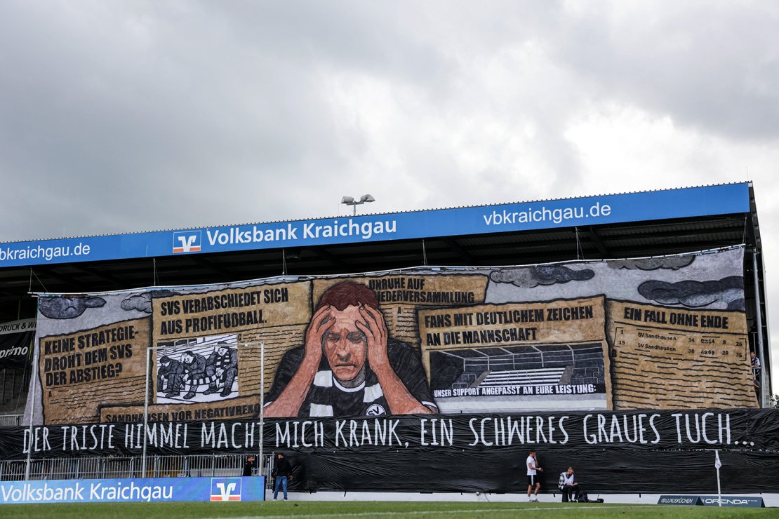Begleitet von einer beeindruckenden, zweiteiligen Choreografie auf der Tribüne startete die Begegnung. Im ersten Heimspiel der neuen Regionalliga-Saison erwischten die Gäste aus Frankfurt den besseren Start. Bereits nach zwei Minuten zappelte der Ball im Netz, doch der Treffer wurde wegen einer Abseitsstellung aberkannt. Auf der Gegenseite bot sich dem SVS die frühe Führung: Kolbe köpfte eine Flanke von Testroet aufs Tor, doch ein Frankfurter Verteidiger klärte auf der Linie (4.).