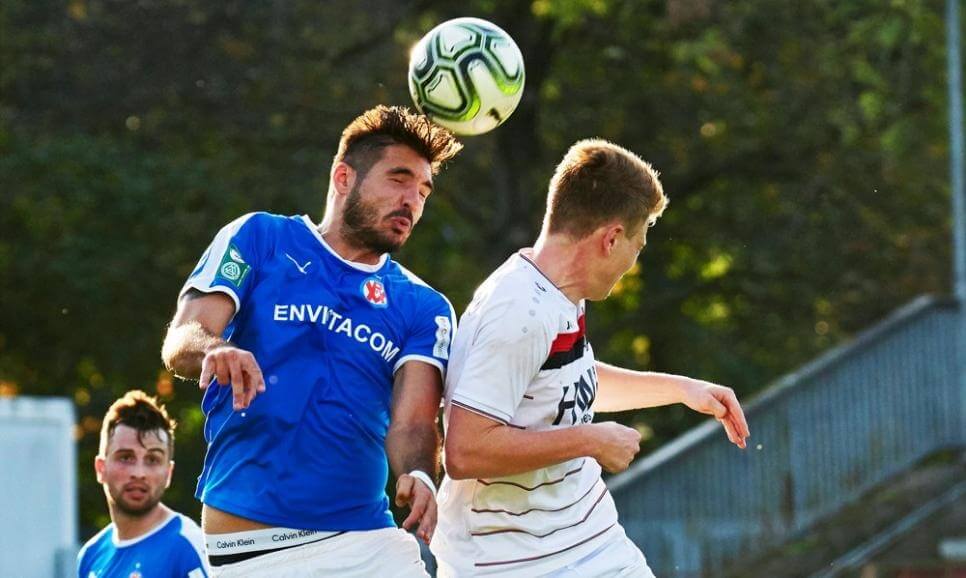Georgios Roumeliotis (blau) beim gewonnenen Kopfballduell gegen seinen Eppinger Gegenspieler (Spielszene VfR Mannheim – VfB Eppingen). Bild: Berno Nix