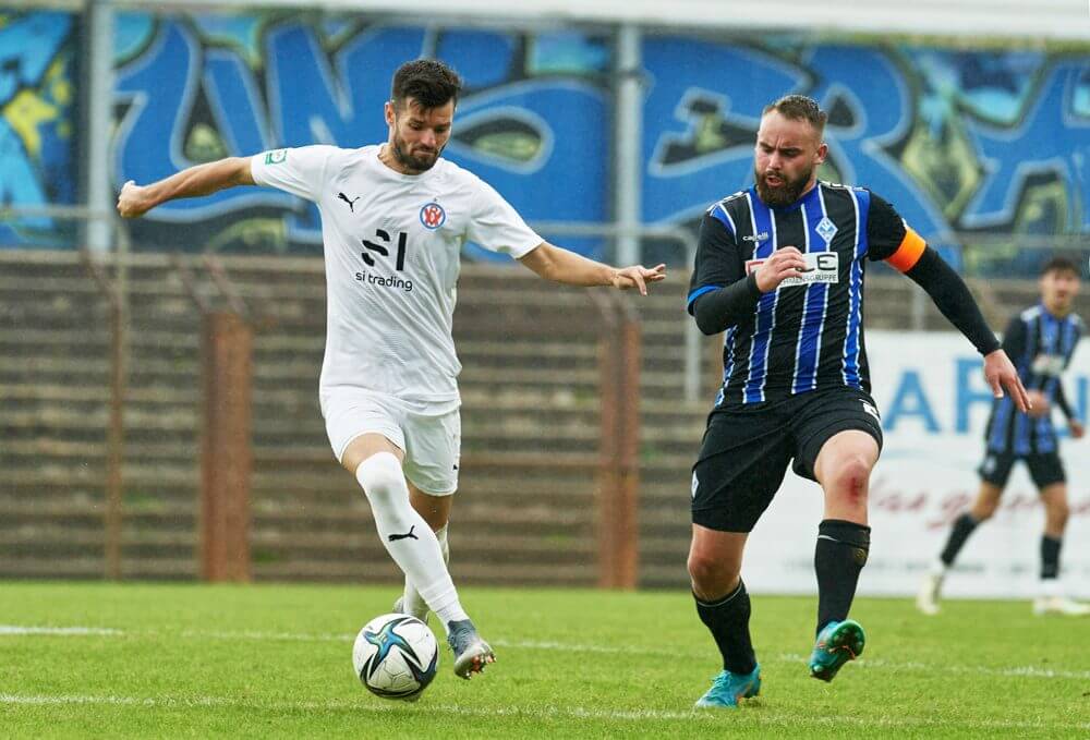 SV Waldhof Mannheim II – VfR Mannheim, Verbandsliga, v.l Mannheims Nicolas Jüllich gegen Waldhofs Spielführer Kelmend Azizi. Foto: Berno Nix