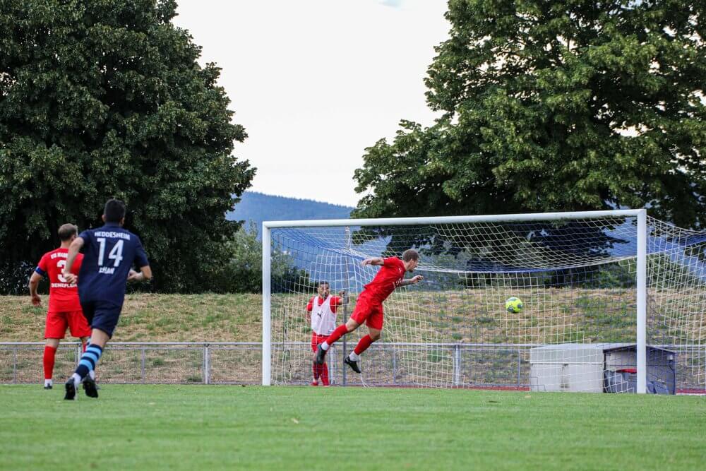 Der Oberligaaufsteiger kam besser in diese Partie hinein. Schon in der 3. Minute tauchte ein VfR-Akteur im Strafraum frei vor Torhüter Dennis Broll auf, wurde aber noch geblockt. Das 0:1 zu einfach in Minute 14, als sich die Rasenspieler mit vier schönen Ballpassagen vor das Tor der Heddesheimer spielten und Marcel Titsch Rivero zum 0:1 traf.