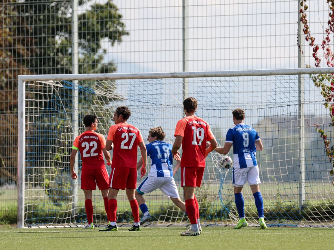 Die Qualität des Mühlhausener Torjägers Tim-Sebastian Buchheister zeigte sich in der 23. Minute, begünstigt durch das Fehlverhalten der Fortunen. Buchheisters Torschuss landete zum 1:1 in den Maschen des Heddesheimer Tores.
