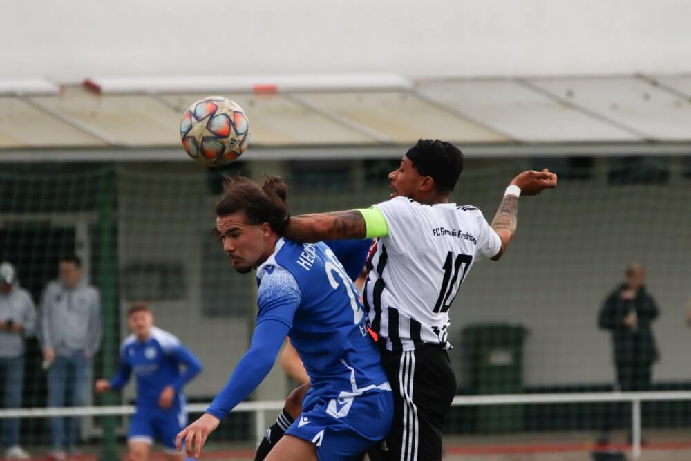 Heddesheims Ilya Ertanir (blau) im Luftkampf mit Friedrichstals Chris Roosevelt Jones (weiß). Bild: Jano Beron