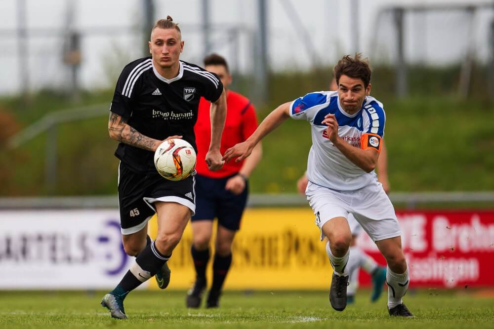 Fabian Czaker (schwarz) kommt vom Oberligaaufsteiger VfR Mannheim. Hier noch im Trikot des TSV Essingen. Der 193 cm große Stürmer bringt Oberligaerfahrung mit. Bild: IMAGO / Eibner.