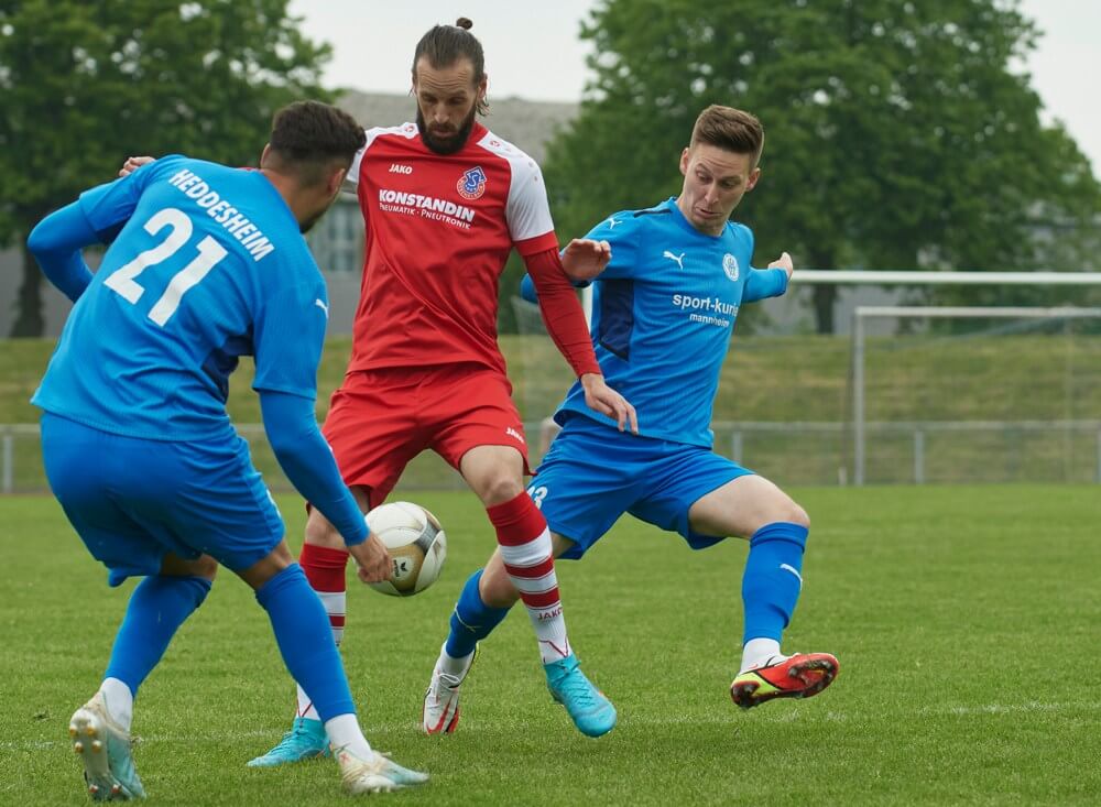 FV Fortuna Heddesheim – ATSV Mutschelbach, Verbandsliga, Mutschelbachs Tobias Stoll zwischen den Heddesheimern Georgios Roumeliotis (li.) und Oliver Malchow (re.). Bild: Berno Nix