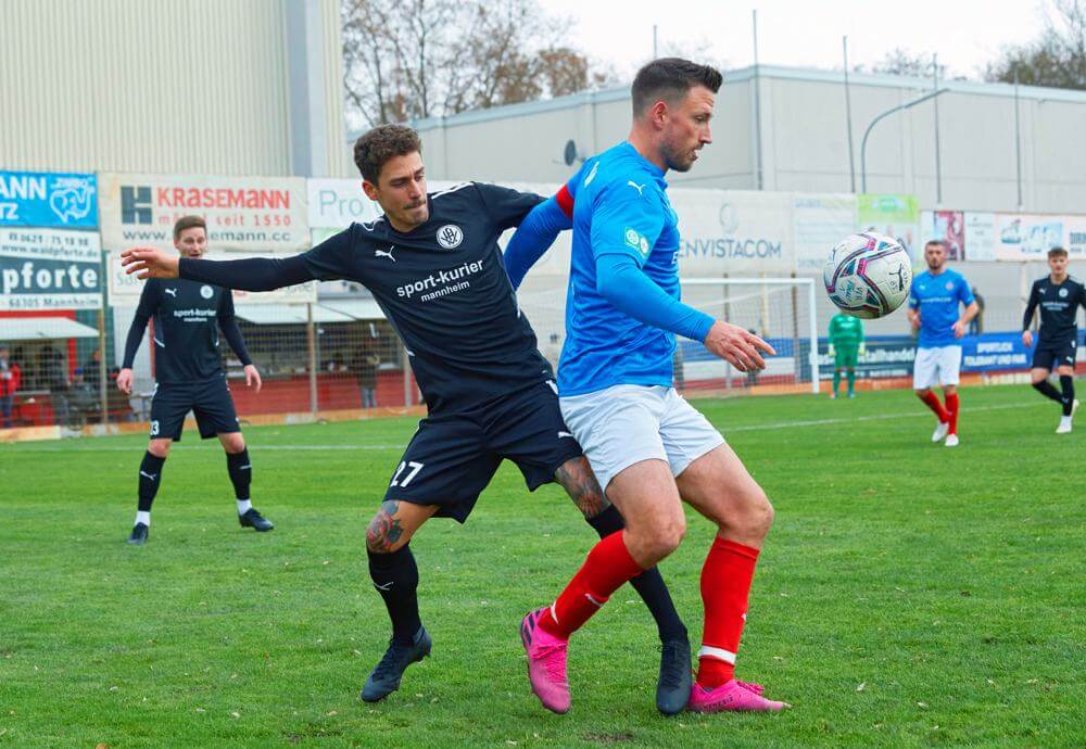 Zweikampfszene zwischen Fabian Lorenz (Heddesheim/schwarz) und Benedikt Koep (VfR/rot). Spiel VfR Mannheim – Fortuna Heddesheim 1:0. Bild: Berno Nix