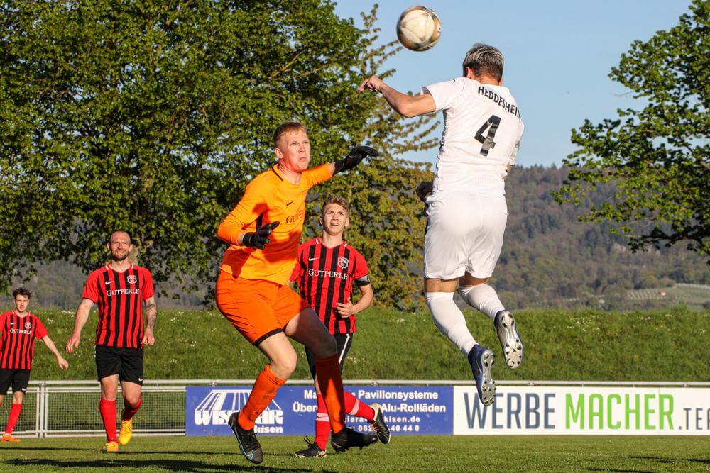 Heddesheims Noel Hesse (Nr. 4) köpft nur eine Minute nach seiner Einwechslung zum 4:0 Endstand. Bild: Alfio Marino.
