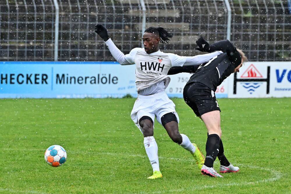 Hände im Spiel. In dieser Szene setzt sich Eppingens Angreifer Edrissa Nyassi (weiß) mit einem klaren Stürmerfoul an Timo Gebhardt (schwarz) durch und trifft dann zum 2:2 (88.). Bild: Siegfried Lörz.