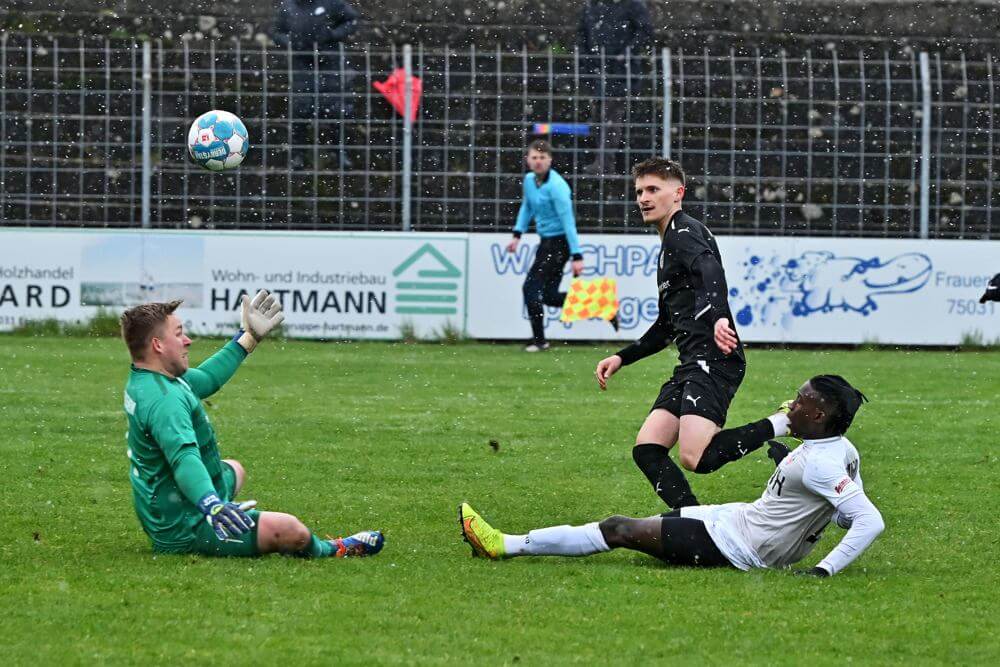 Nyassi (weiß) vollstreckt frei vor Keeper Dennis Broll zum 2:2. Adrian Malburg (schwarz) kann nicht mehr eingreifen. Bild: Siegfried Lörz
