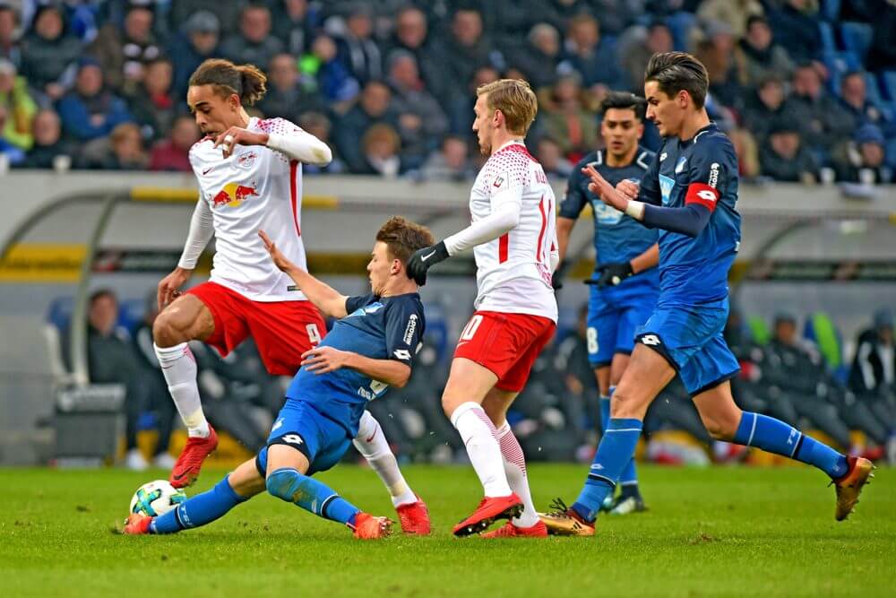 TSG 1899 Hoffenheim vs. RB Leipzig v. li. im Zweikampf Yussuf Poulsen (RB Leipzig) , Dennis Geiger (Hoffenheim), Emil Forsberg (RB Leipzig) und Benjamin Hübner. Bild: Siegfried Lörz.