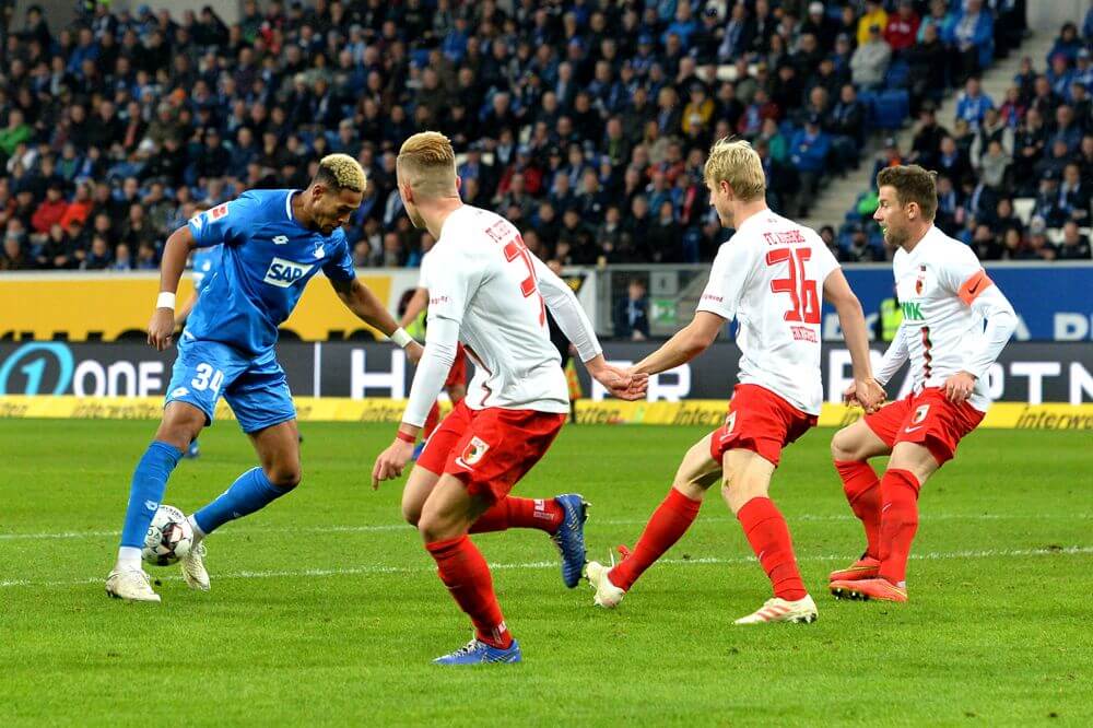 1. BL – 18/19 – TSG 1899 Hoffenheim vs. FC Augsburgv. li. im Zweikampf Joelinton Cassio Apolinaro de Lira (Hoffenheim), Jeffrey Gouweleeuw, Martin Hinteregger und Daniel Baier (alle FC Augsburg). Bild: Siegfried Lörz