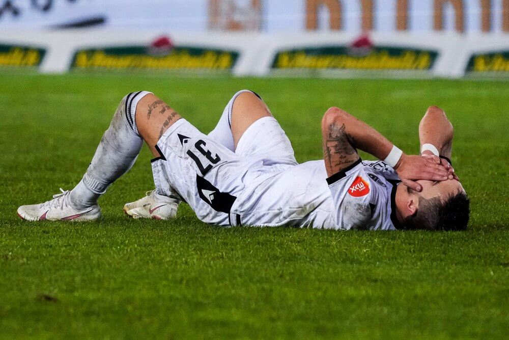 SV Sandhausen vs. 1.FC Nürnberg – Sandhausens Pascal Testroet (SVS, 37) liegt enttäuscht auf dem Rasen. In der Nachspielzeit versetzte Nürnberg dem SVS den Knockout. AS Sportfoto