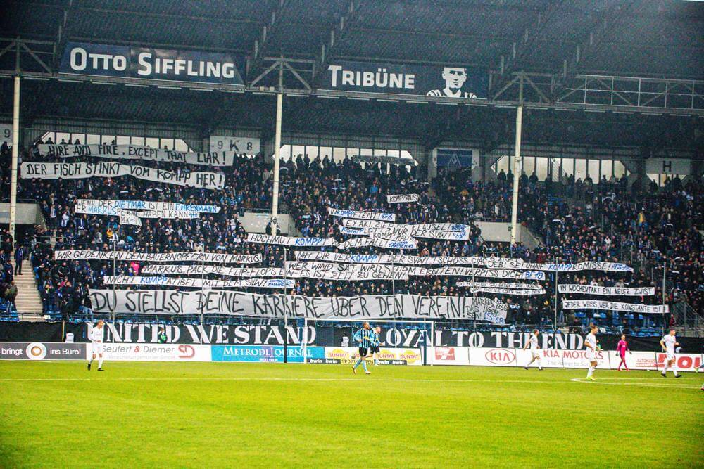 Im Waldhof-Fanblock brachten die Fans den Unmut über Geschäftsführer Markus Kompp zum Ausdruck. Auslöser war die Freistellung des Sportlichen Leiters Jochen Kientz. Bild: Alfio Marino