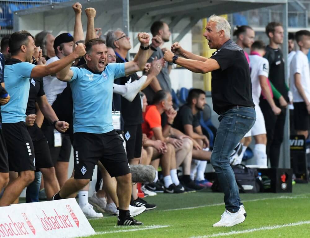 SVW-Coach Christian Neidhart und die Bank nach dem Führungstreffer völlig losgelöst vor Freude. AS Sportfoto