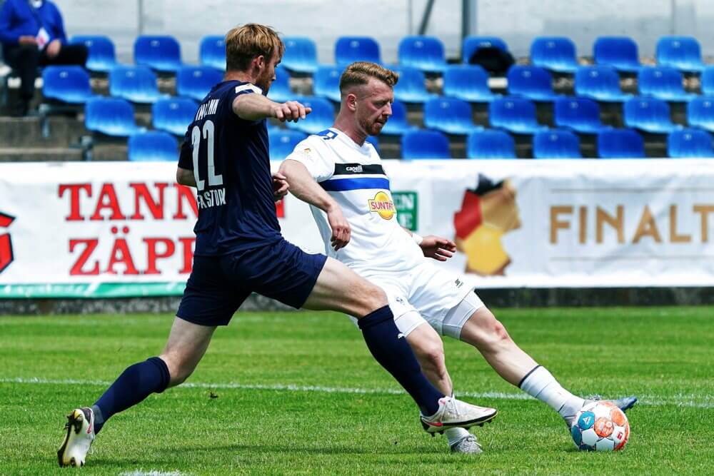 Archivbild: Waldhofs Martinovic (weiß) gegen Walldorfs Hamann. Szene aus dem Pokalfinale Mai 2021. Waldhof siegte mit 2:1 gegen den FC Astoria. AS Sportfoto