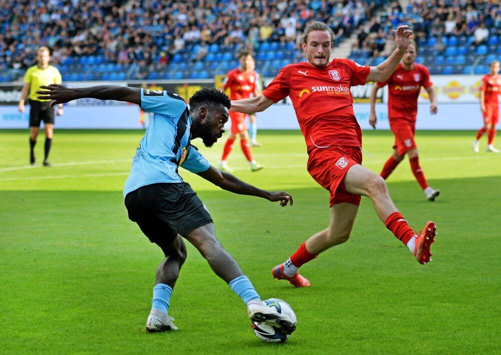 SV Waldhof vs. 1.FC Kaiserslautern - Kenny Prince Redondo (FCK) gegen Gerrit Gohlke (blauschwarz/SVW). AS Sportfoto