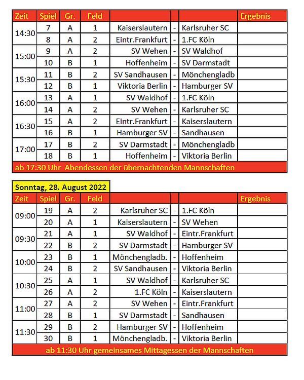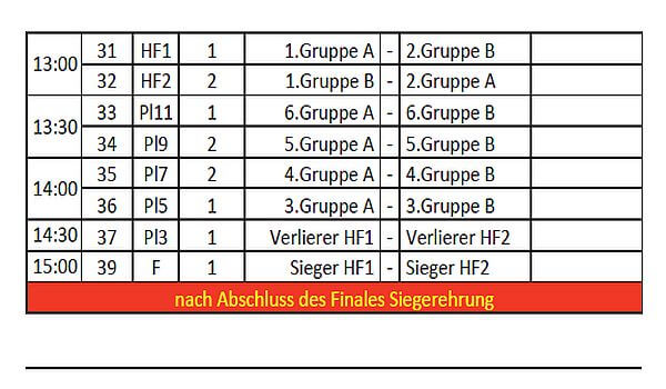 Spielplan für beide Turniertage sowie die Finalspiele am Sonntag.