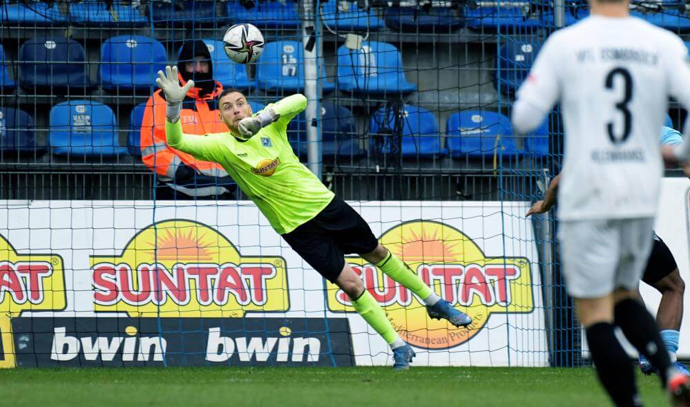 SVW-Keeper Königsmann ist beim Treffer zum 0:1 durch Kunze machtlos. SVW-Vfl Osnabrück – Bild: AS Sportfoto