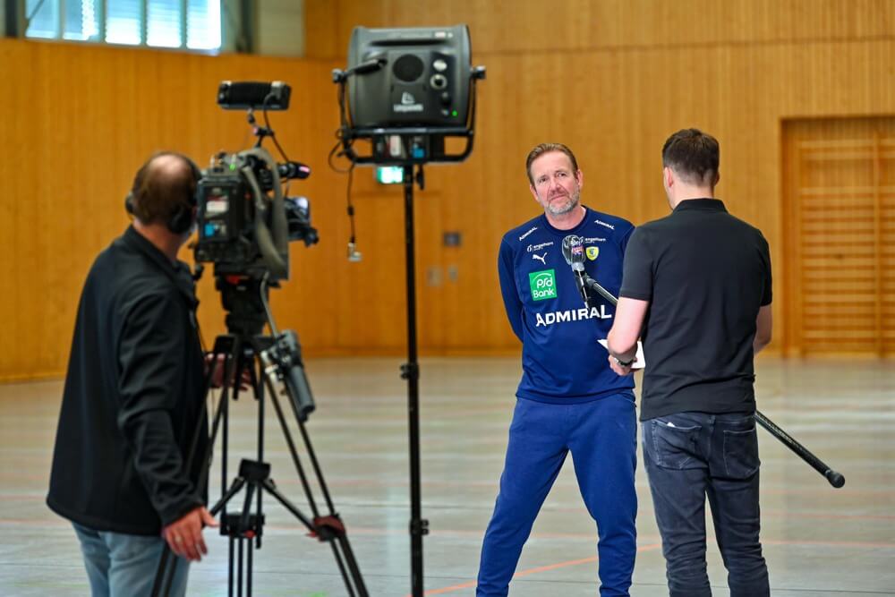 Trainer Martin Schwalb vor Kamera und Mikrofon. AS Sportfotos